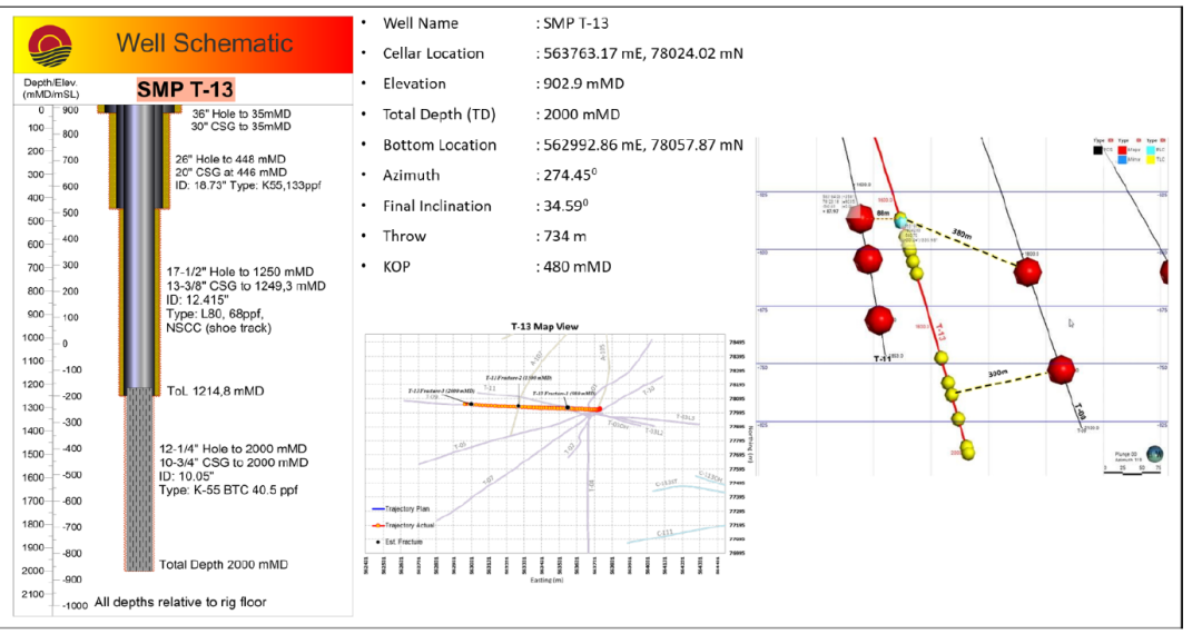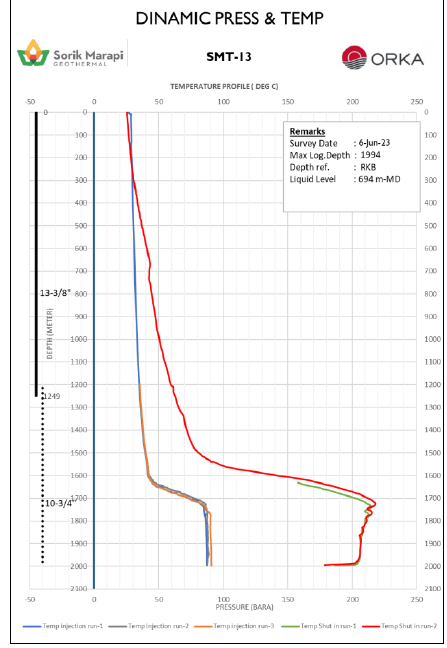 2023年6月(yue)7日,SMGP鉆井(jing)(jing)(jing)(jing)和(he)資源團隊(dui)對(dui)耗時(shi)27天(tian)、于6月(yue)6日完井(jing)(jing)(jing)(jing)的T-13井(jing)(jing)(jing)(jing)進行(xing)了(le)完井(jing)(jing)(jing)(jing)測(ce)試(shi)。測(ce)試(shi)數據顯(xian)示:T-13是一(yi)口高(gao)(gao)溫、高(gao)(gao)流動性的生(sheng)產井(jing)(jing)(jing)(jing),成功打出了(le)因T-11修井(jing)(jing)(jing)(jing)失敗而損失的熱源。該(gai)井(jing)(jing)(jing)(jing)吸水指數在(zai)54.76kg/s/bar到(dao)94.12kg/s/bar之間(jian),在(zai)停止注水后4.5小(xiao)(xiao)時(shi)后井(jing)(jing)(jing)(jing)下最高(gao)(gao)溫度即錄得(de)217.9℃。其生(sheng)產層穩定(ding)在(zai)300℃的情況下,該(gai)井(jing)(jing)(jing)(jing)預計可(ke)生(sheng)產190噸/小(xiao)(xiao)時(shi)的高(gao)(gao)壓蒸汽。