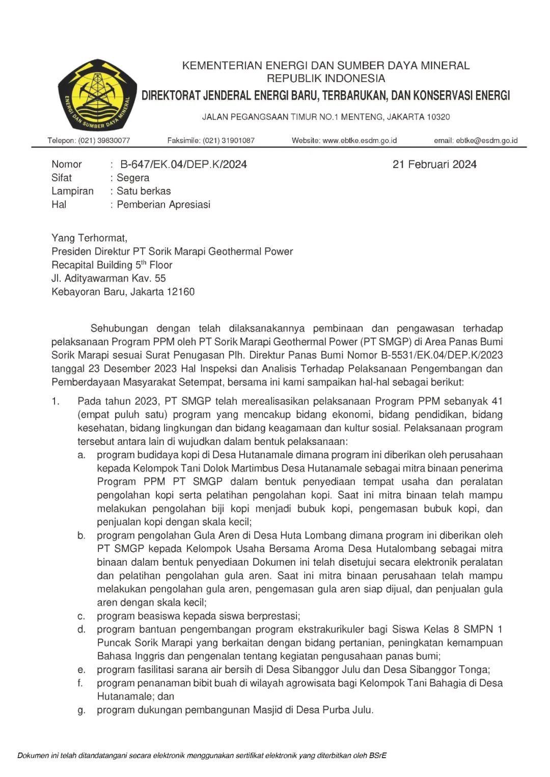 今天上(shang)午,開山集團投資在(zai)蘇門答(da)臘Mandailing Natal縣的(de)地(di)熱(re)項目公司(si)(si)PT SMGP收到一份來自印尼能(neng)礦部可再生(sheng)和新能(neng)源總局(EBTKE)地(di)熱(re)處長Pak Harris簽署的(de)“致PT SMGP的(de)感謝信”,該信函的(de)主旨是對SMGP公司(si)(si) CDCR 團隊為(wei) Sorik Marapi-Roburan 工(gong)作區(qu)(qu)的(de)社(she)區(qu)(qu)發展計劃(hua)(hua)所(suo)做的(de)巨大努力表示感謝。SMGP實施的(de)社(she)區(qu)(qu)發展計劃(hua)(hua)和援助(zhu)表明,除(chu)了為(wei)SMGP運營所(suo)在(zai)地(di)的(de)社(she)區(qu)(qu)持(chi)續(xu)提供(gong)地熱開發所產生的電能(neng)外,公司還致力(li)于提供其他福利。